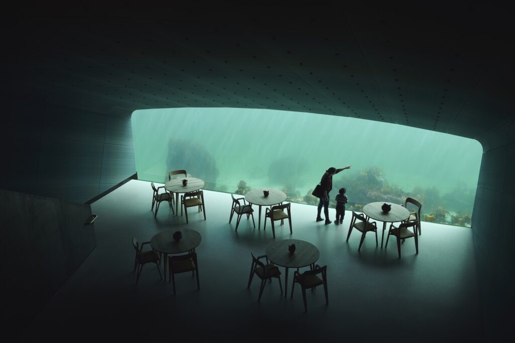 Under’ın ‘denizin altında’ki yemek salonunda sadece ve sadece Norveç’in teruarının sunduğu deniz ürünleri, yosunlar ve endemik bitkiler kullanılıyor. Fotoğraflar: Bo Bedre Norge & Lindesnes Broch
