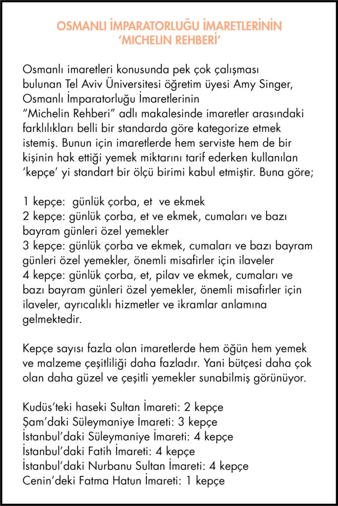 Kudüs’teki Haseki Sultan imaretinde[2] yemek yemiş birinin hatıralarını okurken, böyle ortak bir sofrada buluşmak oldukça çekici geliyor insana. Osmanlı toplumunda yoksulların yemek ihtiyacını karşılayan imaretler, hem ekonominin güçlenmesi, hem de vakıfların yaygınlaşması ve gelişmesiyle oldukça popüler hale gelmişler. Öyle ki; burada pişen yemekler, ritüeller, ve imaretlerin sunduklarından kimlerin faydalanacağı, imparatorluğun neresine gidersen git benzer hale gelmiş; her yolcu ya da yoksul, bir imaretin kapısını çaldığında bir kase sıcak çorba ve bir fodula[3] yiyebilme rahatlığını yaşamıştır.