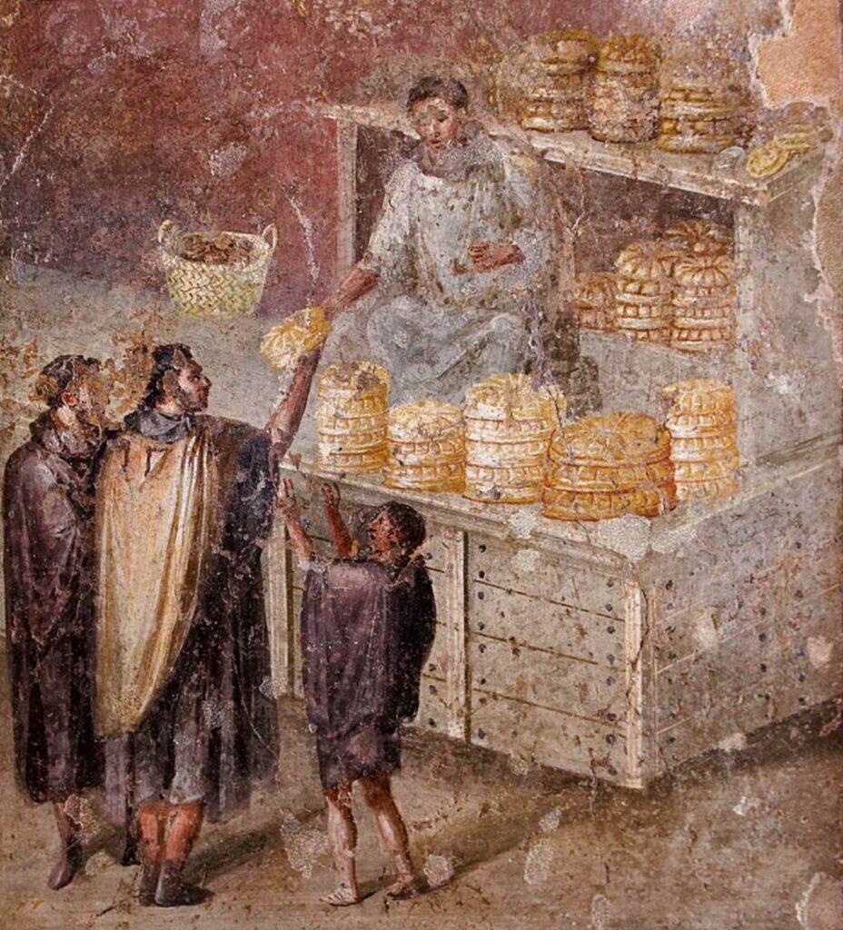 Pompeii’deki Fırıncı Evi veya Casa del Forno’dan (M.S. 79) sözde “Ekmek Satışı” freski. Fresk, ekmeğin bir fırıncı veya satıcı tarafından satışından ziyade, aslında bir siyasi aday veya politikacı tarafından dağıtımını tasvir ettiği için yanıltıcı bir şekilde adlandırılmıştır.