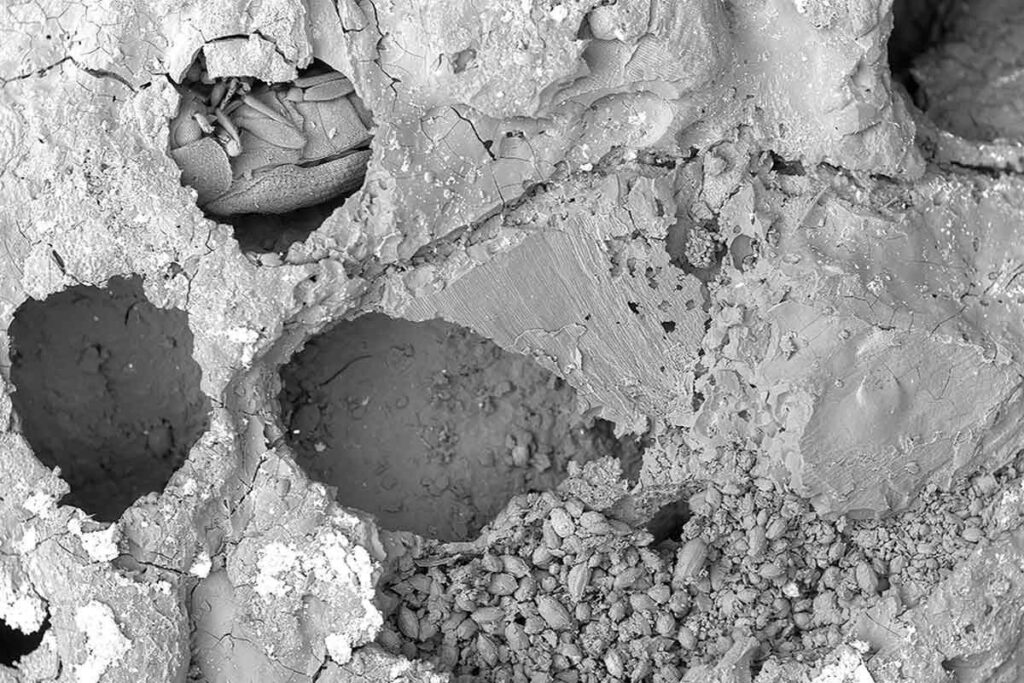 Resimde görülen böcekler, yaklaşık 2 ila 3 milimetre uzunluğundaki bisküvi kınkanatlılarıdır, ancak somun aynı zamanda yetişkin tahıl böceklerini ve her iki türe ait larva parçalarını da barındırmaktadır. Fotoğraf: Cartwright / British Museum
